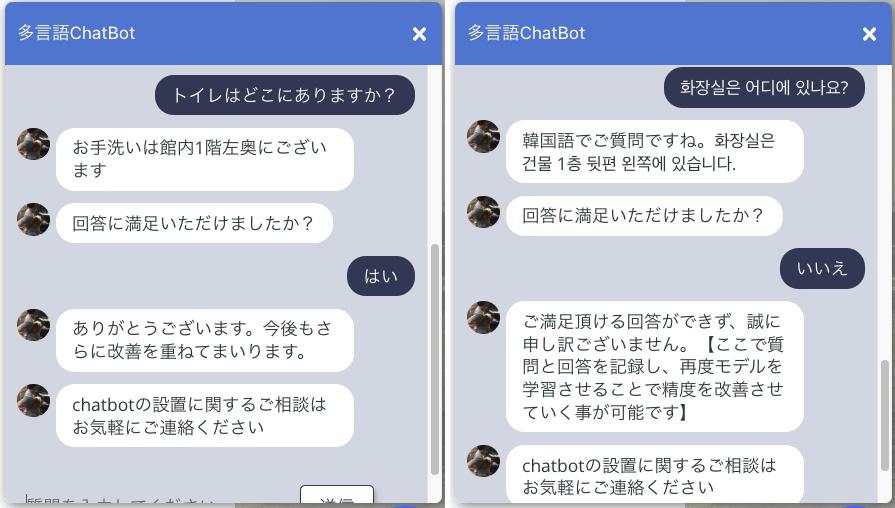 このチャットボットはユーザーが様々な表現で入力した文章をAIが解析し、言語を判別した上で回答します。例えば、韓国語で質問された場合は問い合わせが韓国語だという事を判別した上で、適当な答えを返答します。
