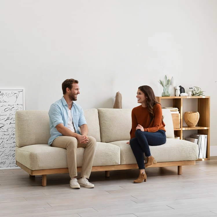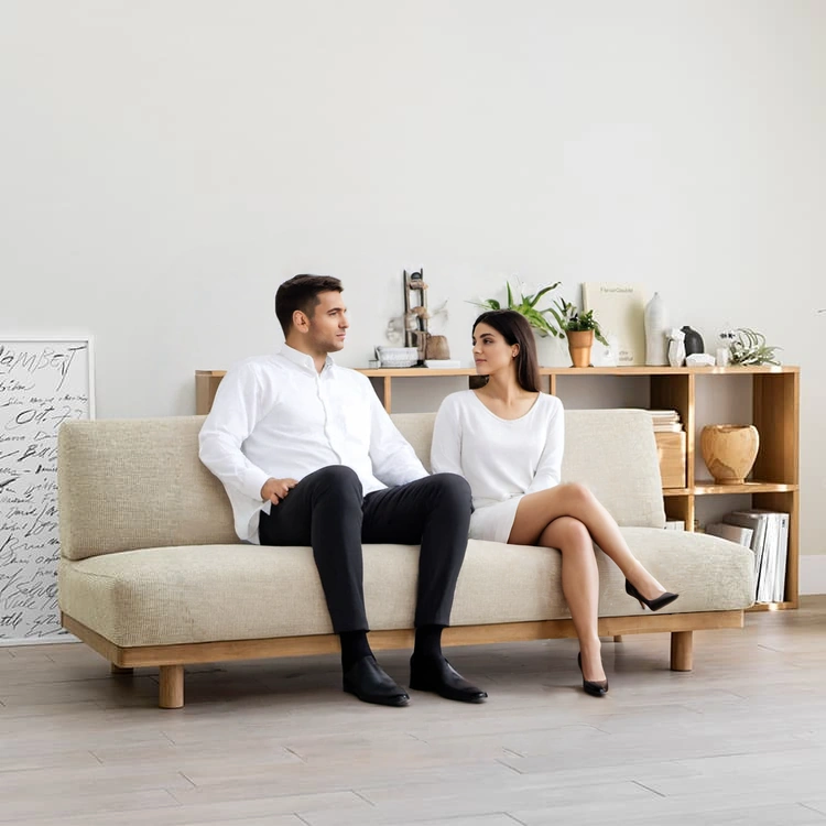 ソファのみの写真を男性と女性が座っている風に人物生成した作品。