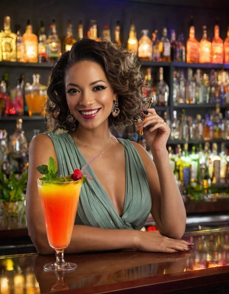 「バーカウンターでカクテルを飲む女性」というプロンプトで生成した作品。