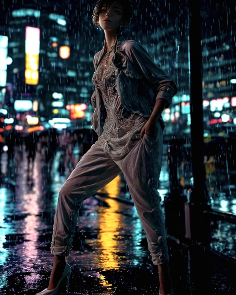 もう一枚はIC-Lightを使って光源を加えた、3Dイラスト風女性が夜の雨の街に立つ作品。